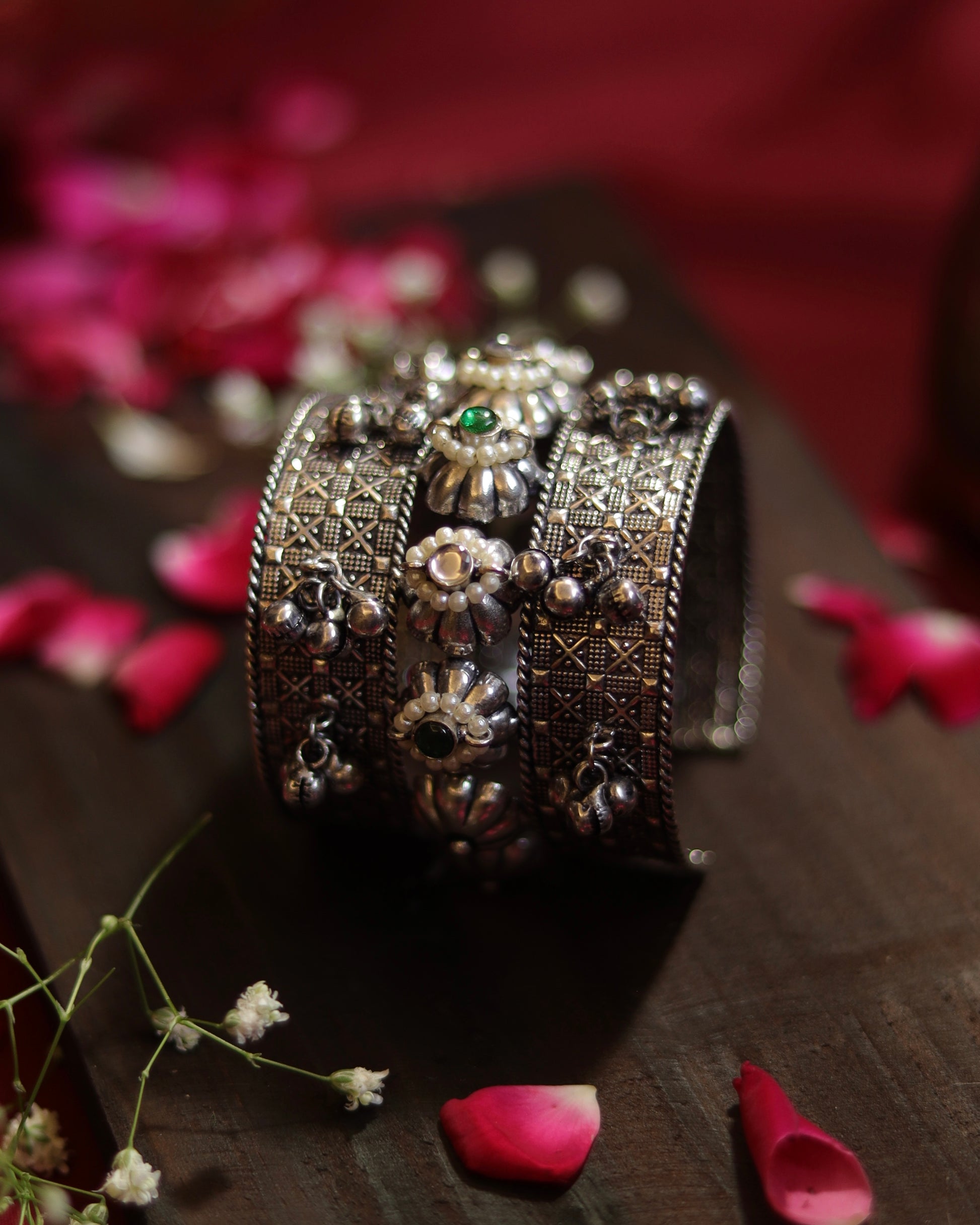 Lightweight oxidised cuff with faux pearls.